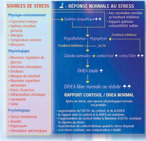Prenons l'exemple d'un jeune cadre dynamique en bonne santé. Pour s'adapter à la pression quotidienne de son travail, son cortisol et sa DHEA augmentent rapidement pour le protéger. La montée du cortisol permet de lutter efficacement contre les agents stressants ; celle de la DHEA apporte une protection contre un surplus de cortisol. À la fin du stress, l'organisme s'est adapté et les taux d'hormones surrénaliennes reviennent dans des valeurs normales. Puis, notre jeune cadre s'adapte à sa société et son stress diminue. Malheureusement, comme tout un chacun, notre cadre vieillit et, malgré ses compétences, doit se battre contre la concurrence pour se maintenir à la hauteur. Alors, il commence à utiliser des stimulants (caféine, nicotine). Il devient peu à peu irritable, agressif, insomniaque et boulimique. La graisse viscérale s'installe ainsi que la fatigue et parfois un état dépressif. Il entre alors dans la phase de stress chronique.