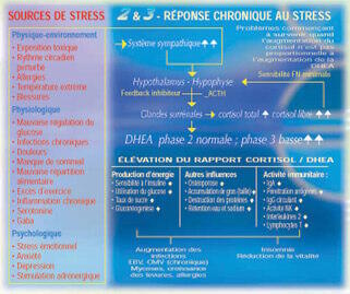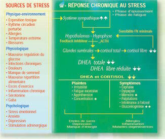 Le cortisol, l'hormone du stress, aiguise les sens et accroît l'aptitude de réaction, préparant le corps à agir de façon appropriée. C'est pourquoi, dans l'exemple du monde du travail, notre cadre a besoin de cortisol pour traverser toutes les épreuves et les sollicitations. À force de « tirer » sur sa surrénale, notre cadre finit en « burn-out ». Les taux de cortisol et de DHEA ont continué à décroître pour atteindre leur niveau le plus bas. Notre cadre fatigué perd de sa créativité et agit machinalement, comme si ce n'était plus son cerveau qui le commandait mais son corps. La fatigue mentale qui s'installe l'amène à se demander au réveil : « Quand vais-je retourner me coucher ? » Les mauvaises prédispositions génétiques, outre la maladie d'Addison qui est une destruction de la glande surrénale, conduisent de nombreuses personnes à une hypoactivité surrénalienne, à la suite d'un mauvais développement glandulaire. Mais un des facteurs les plus graves est l'épuisement de la glande surrénale qui ne produit plus assez de cortisol ni de DHEA. Notre cadre fatigué est devenu neurasthénique et hypochondriaque. Il se plaint constamment d'indispositions diverses. Il se sent nauséeux, absent, confus, distrait, fatigué, la tête vide. Il manque d'appétit ou, à l'inverse, a des envies salées ou sucrées allant jusqu'à la boulimie. Il souffre de coups de pompe (hypoglycémie). Il consulte régulièrement son médecin pour soigner des allergies ou de l'arthrite. Il est souvent en arrêt de travail, son généraliste lui prescrit un antidépresseur et d'autres remèdes pour soigner ses divers problèmes. En outre, il se plaint d'être intolérant aux médicaments. C'est la dernière phase, la glande surrénale ne réagit pas ou peu au stress, le cortisol et la DHEA s'effondrent. Dans la phase d'épuisement, l'organisme déclenche une activité compensatoire de la part d'autres systèmes. Ainsi, avec l'excès de cytokines inflammatoires, les compensateurs peuvent devenir destructeurs. Ce processus semble être engagé dans la fibromyalgie, le syndrome de fatigue chronique, et d'autres pathologies inflammatoires.