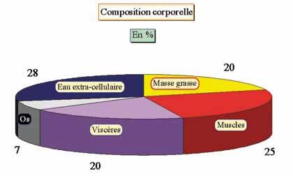 De la même façon, en cas de surpoids ou d'obésité, la rétention hydro-sodée est fréquente (troubles veineux, hyper-insulinisme). En cas de régime restrictif, les premiers kilos perdus sont de l'eau (extra-cellulaire) : 2 à 4 kg, voire beaucoup plus en cas d'obésité massive (10 à 15 kg) et, évidemment, à la sortie de ces régimes, les premiers kilos repris sont de l'eau ! La mesure du seul poids ne suffit pas. Pour toutes ces raisons, il faut connaître la composition corporelle à un instant donné. De la même façon, les variations hormonales dans notre corps au cours du vieillissement, de certaines maladies ou de certaines thérapies modifient profondément nos compartiments corporels. La mesure de la composition corporelle est un instrument très précieux pour connaître le statut corporel de base de l'individu et en suivre l'évolution. On peut refaire ce type d'examen très régulièrement à 6 mois, un an… pour suivre avec précision l'évolution des différents compartiments corporels et guider la prise en charge.