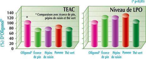 La valeur TEAC indique la force relative d'un antioxydant comparée à la capacité antioxydante du Trolox, un analogue de l'alpha-tocophérol. 49 et 66 jours après les injections, la capacité antioxydante était la plus élevée dans le groupe prenant de l'Oligonol®. Celle des animaux recevant de l'extrait de pépins de raisin était similaire à celle des animaux non supplémentés. Les niveaux d'oxydation des lipides dans le cerveau, le cœur et le foie des animaux ayant reçu de l'Oligonol® étaient nettement réprimés par rapport à ceux des animaux non supplémentés. Il n'y avait cependant pas de différence significative entre l'extrait de pépins de raisin et Oligonol®.