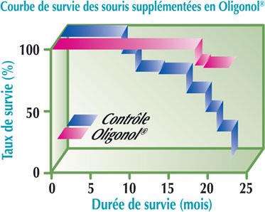 Nous avons réalisé une étude montrant que des souris supplémentées avec Oligonol® vivent nettement plus longtemps que des animaux témoins. Ces résultats suggèrent que la puissante capacité antioxydante d'Oligonol® pourrait ralentir le processus du vieillissement.