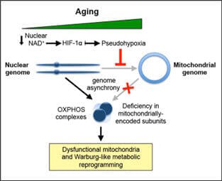 On sait avec certitude que le dysfonctionnement mitochondrial est une caractéristique du vieillissement, mais ses causes sont actuellement encore discutées. Lors de cette étude, les chercheurs ont ainsi démontré qu’au cours du vieillissement, il existe une perte spécifique au niveau mitochondrial, mais pas au niveau nucléaire, des sous-unités codées OXPHOS. Ainsi, ils défendent la théorie qu’une baisse de NAD+ nucléaire induit un état de pseudo-hypoxie (par augmentation de HIF-1α) qui perturbe la communication entre les génomes nucléaires et mitochondriaux (indépendamment du PGC-1α/β).