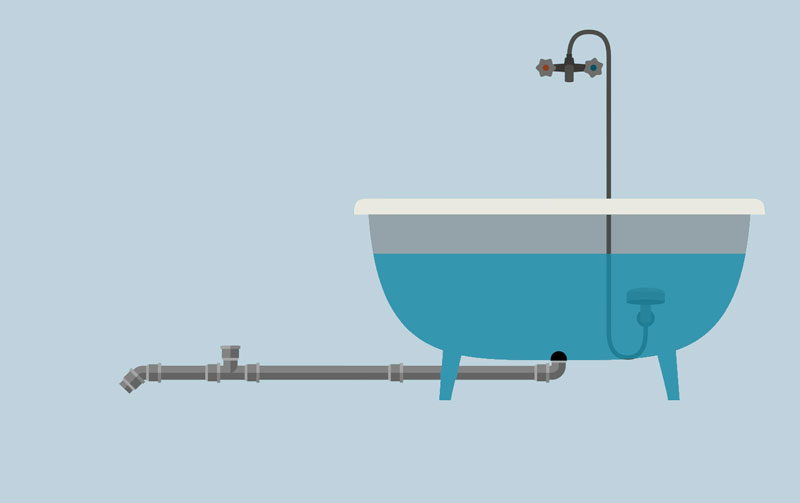 Pour faire simple, imaginez une baignoire à moitié remplie, avec un robinet classique qui fait grimper le niveau d’eau, un bouchon qui permet d’éviter les fuites, et un pommeau de douche qui serait placé au fond de la baignoire.