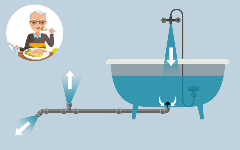 2) Elle met, ensuite, en place un système de siphon dans les canalisations pour « aspirer » l’eau en trop dans la baignoire et accélérer le flux d’évacuation.