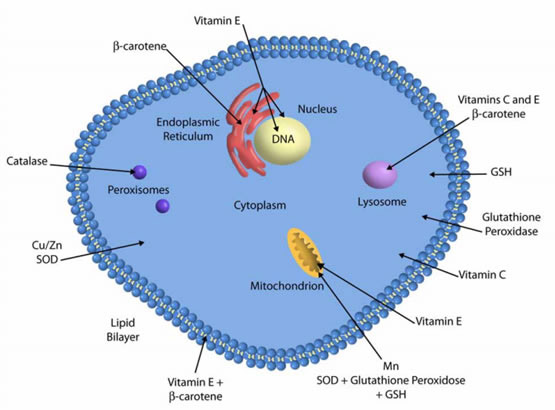 L’organisme utilise donc deux type de « soldats » pour s’opposer aux ERO : les antioxydants endogènes (c’est-à-dire qu’il fabrique lui-même) et les antioxydants exogènes (qu’il trouve dans l’alimentation). Et chaque type d’antioxydant a son terrain de prédilection : certains comme la vitamine E sont spécialement entraînés pour évoluer sur des terrains gras tels que les membranes cellulaires, d’autres comme la vitamine C au sein de milieux aqueux tels que le cytoplasme.