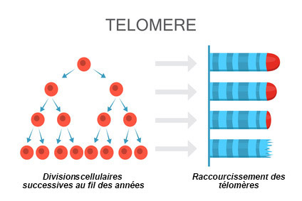 Il y a plusieurs décennies, les chercheurs ont découvert que nos chromosomes, ces éléments qui portent nos gènes, raccourcissaient de manière régulière en vieillissant. Pour éviter que des gènes ne fassent les frais de cette anomalie, l’organisme a placé des séquences d’ADN complètement inutiles aux extrémités. De cette façon, les chromosomes raccourcissent mais aucun gène ne disparait. Malheureusement, ces séquences inutiles ne sont pas infinies et tôt ou tard, un premier gène se volatilise, emportant avec lui de précieuses informations génétiques. A partir de ce moment, le raccourcissement inexorable des chromosomes va engendrer la disparition de nombreux gènes et provoquer des dysfonctionnements majeurs dans les cellules, et dans tout l’organisme. Quand elles atteignent ce stade, la plupart des cellules se suicident pour éviter la catastrophe. C’est une autre composante du vieillissement…