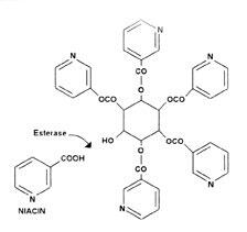 L'inositol hexanicotinate (IHN) est composé de six molécules d'acide nicotinique avec, au centre, une molécule d'inositol. Dans l'organisme, il se métabolise en différents composants dont il est formé, la niacine et l'inositol. Il fut décrit aux États-Unis pour la première fois en 1945 par Badgett et al. Il semble que ce composant soit métabolisé doucement et qu'il n'atteigne son niveau sérique maximal qu'environ 10 heures après son ingestion1. Lorsqu'il est administré à l'homme par voie orale, il augmente les niveaux d'acide nicotinique libre dans le sang et le plasma. |
