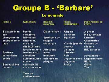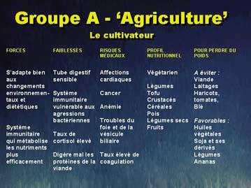 Les personnes de ce groupe, génétiquement mieux adaptées aux glucides, peuvent se permettre d'en consommer de plus grandes quantités que celles du groupeO. Toutefois, elles digèrent moins bien les protéines, leurs taux d'acidité gastrique (HCL) et d'enzyme intestinale “phosphatase alcaline” étant faibles. Elles ont généralement des concentrations de graisse corporelle plus faibles que la moyenne et possèdent un FTG (Facteur de Tolérance aux Glucides) plus élevé que la normale. Leur taux de cortisol génétiquement élevé les prédispose aux risques cardiovasculaires et aux cancers ainsi qu'aux TOC (Troubles Obsessionnels Compulsifs). Elles supportent mal les situations de stress. |