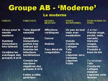 Toutefois, comme les personnes du groupeO, elles doivent éviter le gluten, la gliadine (protéines) du germe de blé et les produits à base de blé complet (ralentissement du métabolisme et de la digestion des protéines). |
