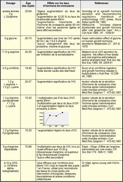 La prise d'un ou de plusieurs acides aminés démontre des effets sur l'hormone de croissance endogène. Beaucoup d'acides aminés sont des précurseurs de la fabrication de l'hormone de croissance mais leurs atouts puissants sont de stimuler sa production. La glycine à la dose de 6g, chez les hommes d'âge moyen, augmente la production d'hormone de croissance sans affecter les autres hormones (tab). La L.glutamine, la plus prometteuse, à 2 g a les mêmes effets. (tab). Le mélange L.arginine/L.ornithine ou L.arginine/ L-lysine à petites doses (3-6g/j) potentialise les effets de l'hormone de croissance à divers niveaux. Une série d'études par Ghigo et son équipe démontre que des doses orales de 8 gr de L.arginine-L.aspartate restaurent l'hypophyse afin de produire de l'hormone de croissance chez les personnes âgées (tab). Isodori et son équipe rapportent que la dose de 1.2g de L.Arginine pyroglutamate avec 1.2 g de L.Lysine cause une augmentation impressionnante des niveaux d'hormone de croissance et d'IGF-1 chez les jeunes athlètes (tab).