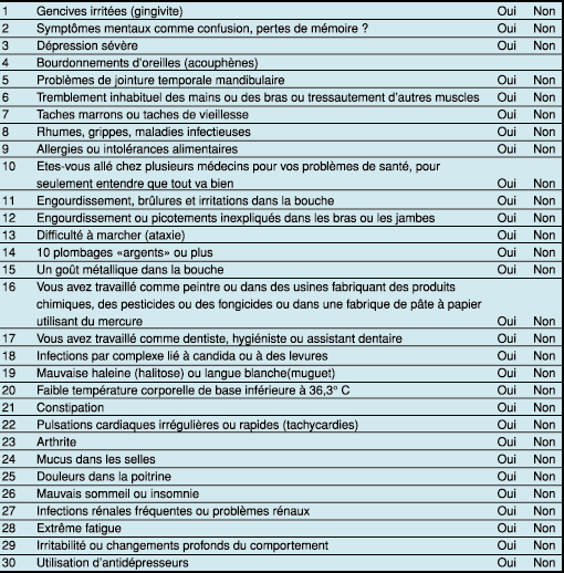 | Questionnaire de sensibilité au métal toxique/mercure | |