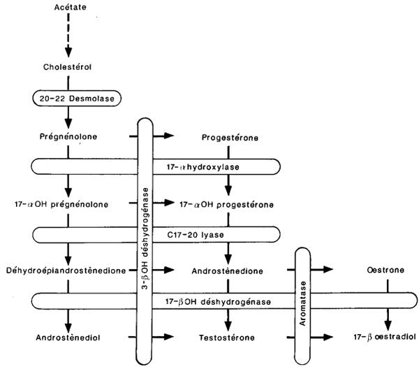 La testostérone est une hormone stéroïde dérivée du cholestérol. Elle est le principal stéroïde secrété par le testicule, tant en quantité qu'en activité biologique. La production quotidienne est de 5 à 6 mg par 24 h. La dihydrotestostérone est l'androgène actif au niveau des sites périphériques. Elle est synthétisée localement après réduction de la testostérone par une enzyme, la 5-alpha réductase (la testostérone a alors un rôle de pro hormone). Chez l'homme, le vieillissement s'accompagne d'une réduction progressive de l'activité génitale, de la fertilité, du volume testiculaire, de la masse musculaire et de la pilosité. La testostérone est plus basse chez le sujet âgé. Cette diminution est le reflet d'un fléchissement de la production testiculaire à partir de 40 ans. Le taux de TeBG (Testosterone Binding Globulin ou protéine porteuse de la testostérone plasmatique) augmente avec l'âge. Cette élévation s'accompagne d'une baisse de la testostérone plasmatique biodisponible (testostérone libre) et d'une augmentation du taux plasmatique de LH (Luteinising Hormone) ; cette hormone est secrétée par l'hypophyse et stimule la synthèse de testostérone. Son élévation chez l'homme est le reflet d'un taux plasmatique insuffisant en testostérone. Le vieillissement testiculaire s'accompagne d'une diminution de la réaction de la réponse des cellules de Leydig à la stimulation par la LH. Ceci semble dû essentiellement à une diminution du nombre total de cellules sécrétrices de testostérone présentes dans l'interstitium. Enfin, l'étude des concentrations de précurseurs de la testostérone dans la veine spermatique met en évidence une diminution de la voie métabolique de synthèse de la testostérone. De plus, la prise de nombreux médicaments entraîne une baisse indésirable du taux de testostérone : les œstrogènes, les anti-androgènes, les stéroïdes anabolisants, la spironolactone (diurétique), le kétaconazole et la digoxine. D'autres drogues, assez nombreuses, sont sans effet sur la testostéronémie mais peuvent être responsable d'impuissance par d'autres mécanismes ; ce sont en particulier les fibrates (hypolipidémiants), certains antidépresseurs et certains antihypertenseurs. |