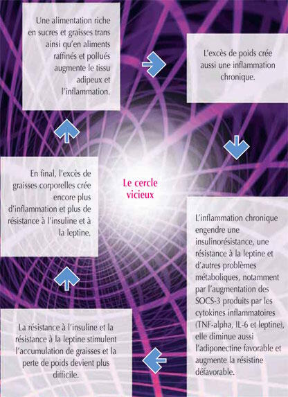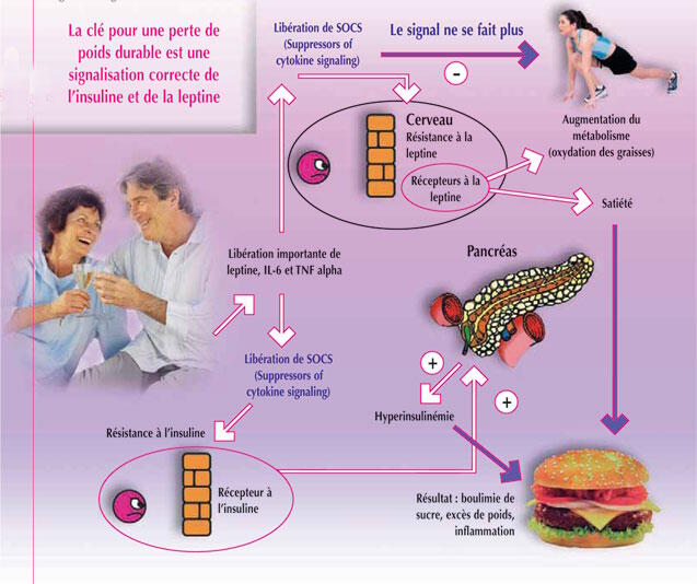 Les personnes en surpoids sont donc soumises à une inflammation chronique silencieuse engendrée par leur tissu adipeux qui rend le cerveau et l'organisme résistants aux effets régulateurs de la leptine et d'autres hormones, y compris l'insuline et cortisol. Une dose excessive d'insuline et de cortisol empêche la perte de poids.