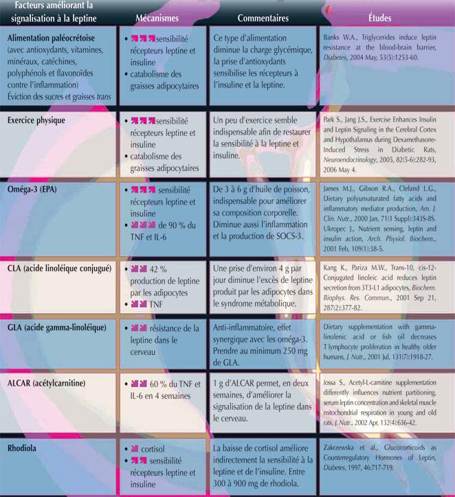 Une bonne signalisation de la leptine réduit la graisse intracellulaire, stimule le métabolisme de base ainsi que celui de la thyroïde, sensibilise les récepteurs à l'insuline et améliore le profil neuroendocrinien. Malheureusement, avec l'âge, le surpoids et l'inflammation, l'organisme répond par la leptino-résistance. Un cercle vicieux s'installe ; pour venir à bout de cette physiologie inadaptée, il faudra agir de façon multiple avec l'éradication d'aliments inappropriés et par une hygiène de vie performante, comprenant une alimentation adéquate, de l'exercice et enfin des suppléments naturels permettant d'agir vite, efficacement et de façon saine.
